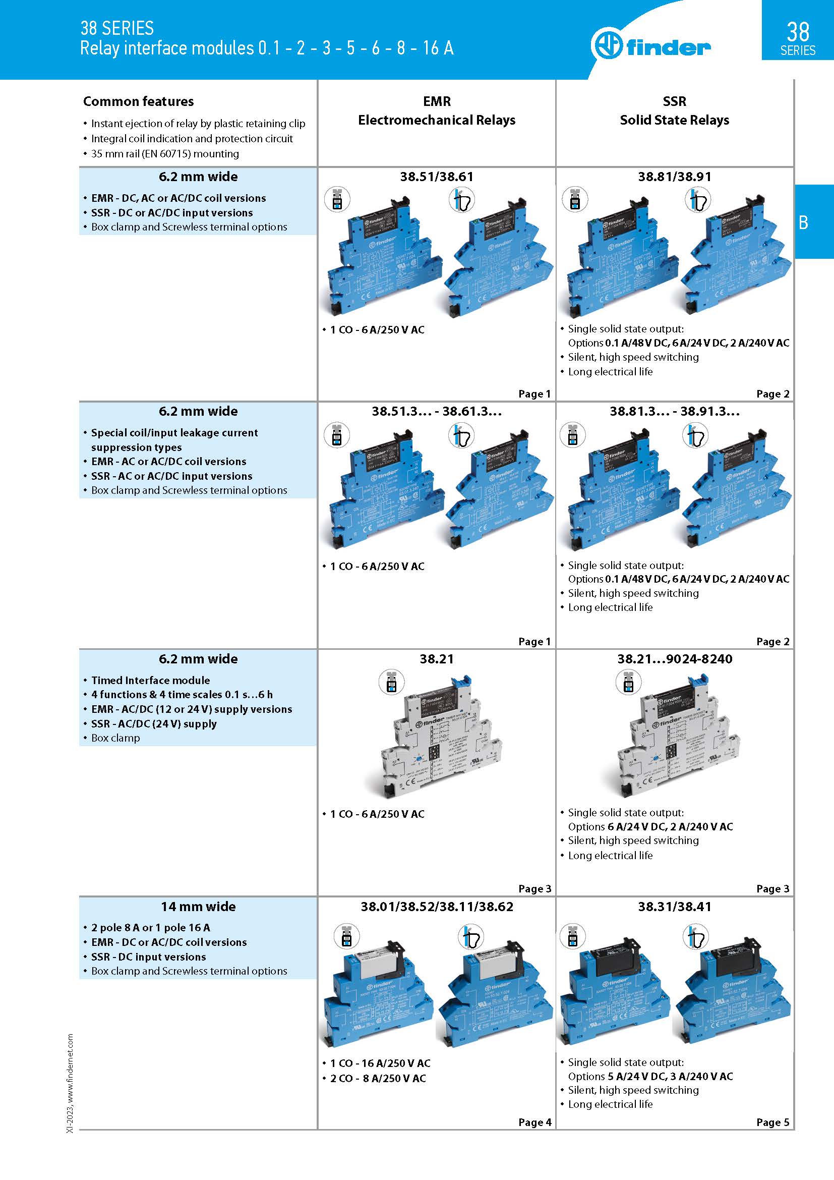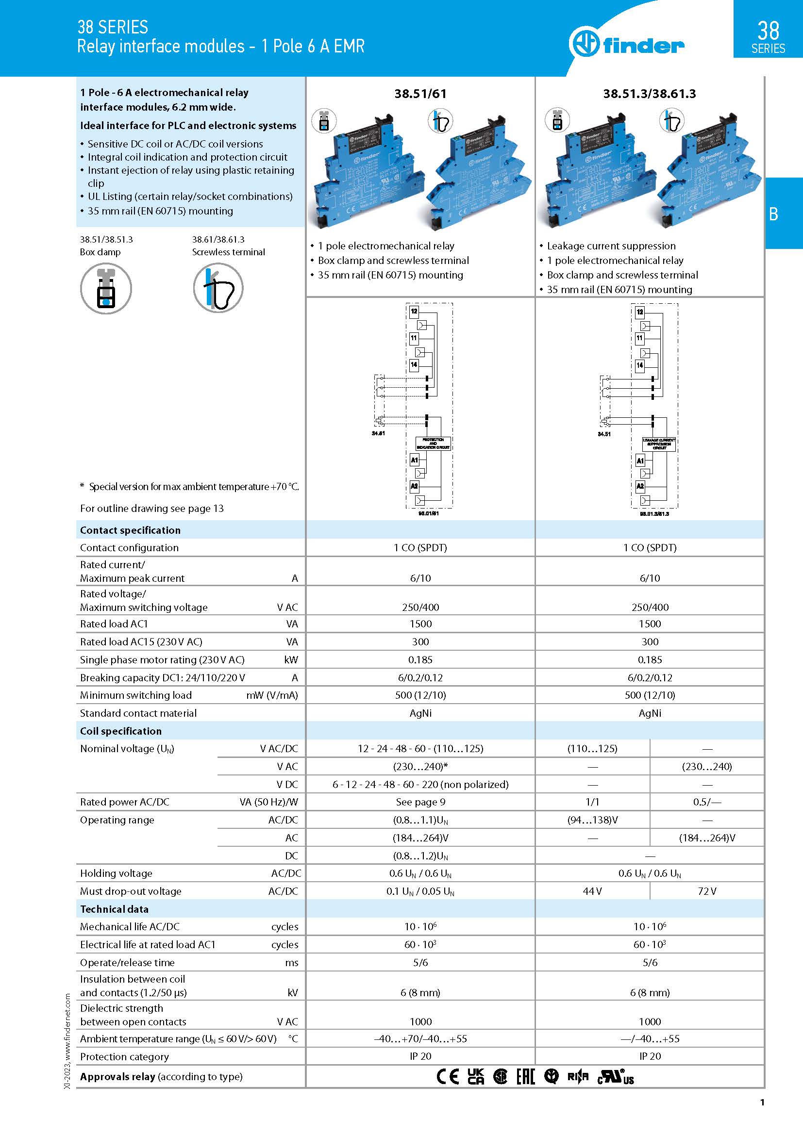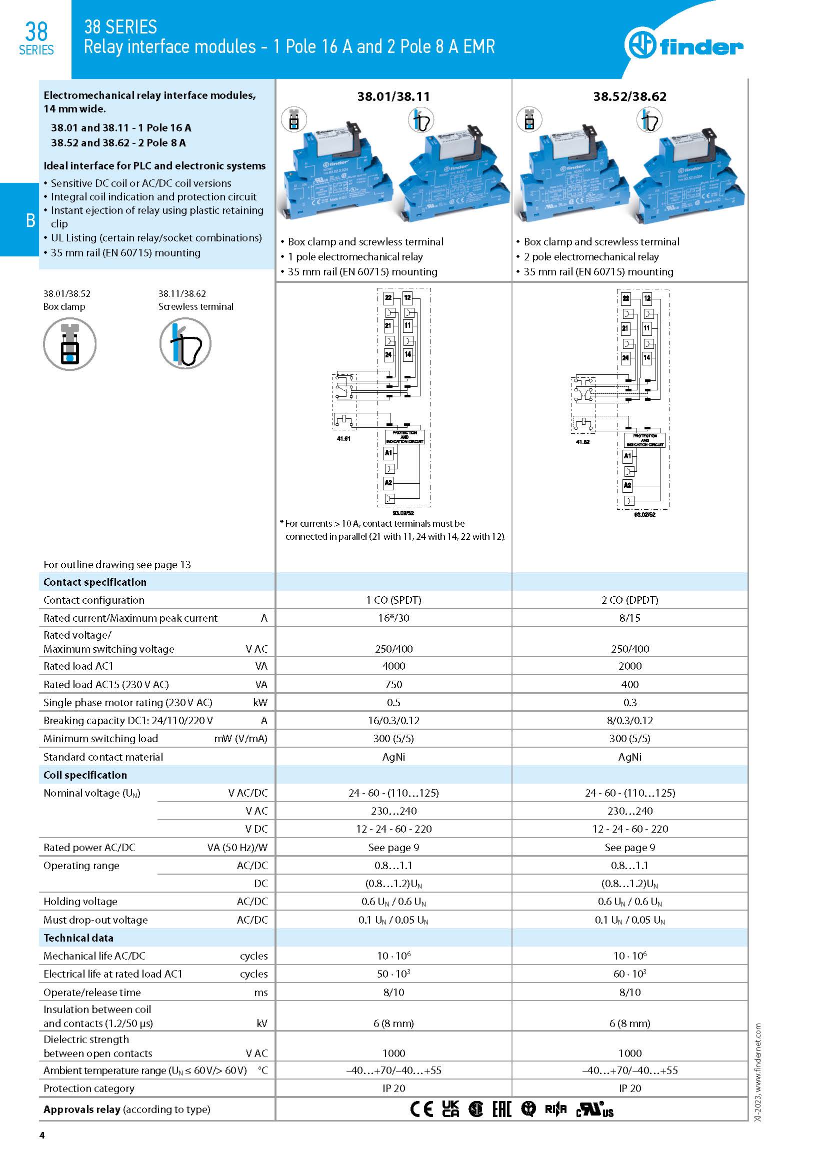 Type 38.01 Relay Interface Modules with (EMR) electromechanical relay, 1 CO 16 A, width 14 mm. Designed for interfacing with PLC systems